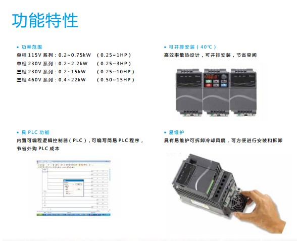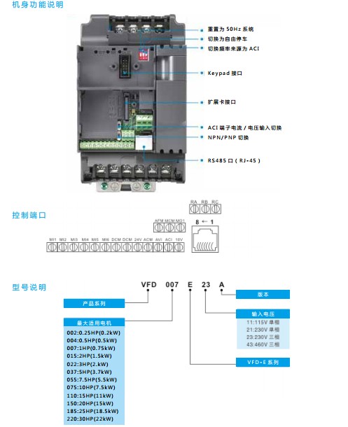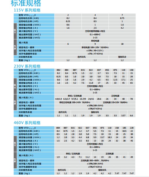 | VFD-E | VFD022E23A | 3P220V,2200W,IP20,內(nèi)置煞車單元 |
