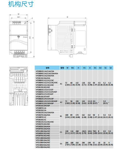 | VFD-EL | VFD002EL21A | 1P230V,200W,無(wú)剎車單元,內(nèi)置EMC濾波器 |