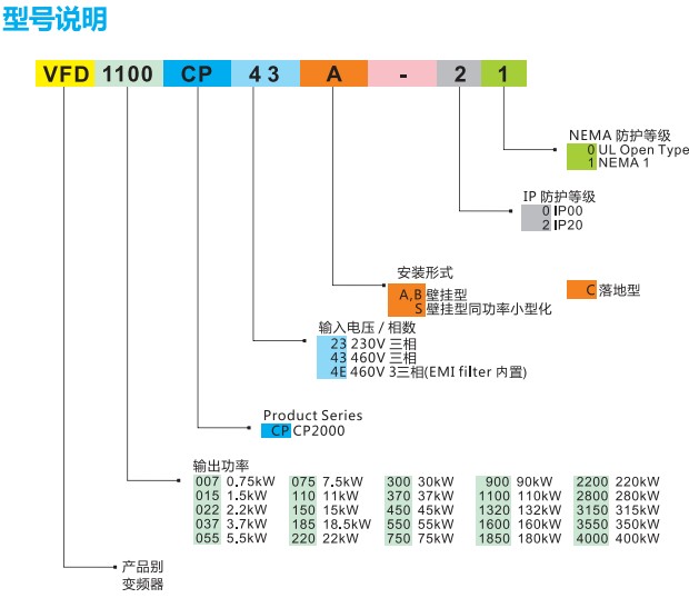 | VFD-CP | VFD1100CP43A-21 | 內(nèi)380V/3P,110kW,置10k PLC,剎車選購,DC電抗內(nèi)建, UL,CE,IP20,NEMA1 |