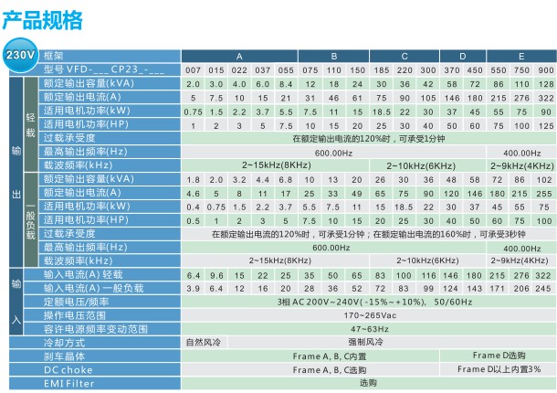 | VFD-CP | VFD550CP23A-00 | 220V/3P,55kW,內(nèi)置10k PLC,剎車內(nèi)建,DC電抗選購, UL,CE,IP00,UL OPEN TYPE |