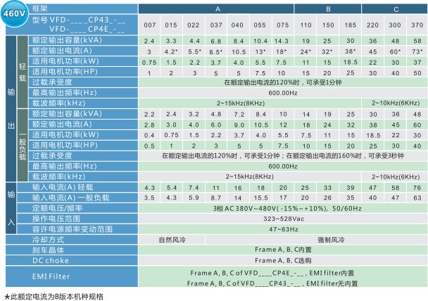 | VFD-CP | VFD040CP43A-21 | 380V/3P,4kW,內(nèi)置10k PLC,剎車選購,DC電抗內(nèi)建, UL,CE,IP20,NEMA1 |