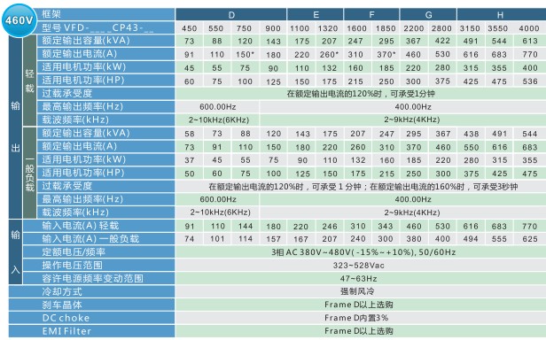 | VFD-CP | VFD450CP43A-21 | 380V/3P,45kW,內(nèi)置10k PLC,剎車選購,DC電抗內(nèi)建, UL,CE,IP20,NEMA1 |