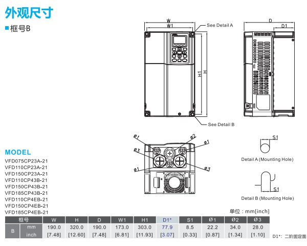 | VFD-CP | VFD750CP43B-21 | 380V/3P,75kW,內(nèi)置10k PLC,剎車選購,DC電抗內(nèi)建, UL,CE,IP20,NEMA1 |