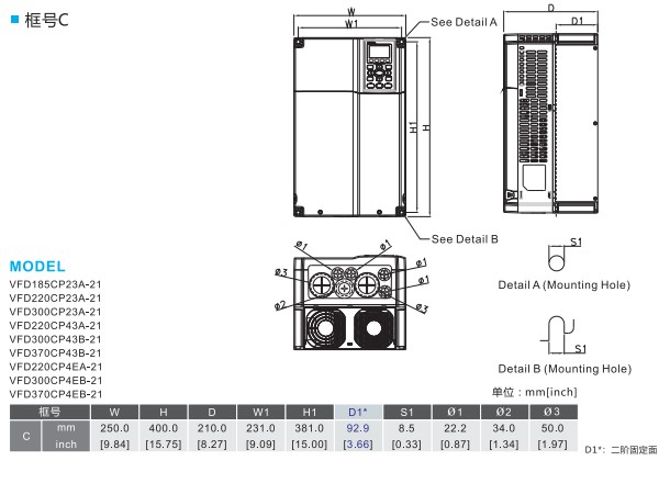 | VFD-CP | VFD185CP43B-21 | 380V/3P,18.5kW,內(nèi)置10k PLC,剎車選購,DC電抗內(nèi)建, UL,CE,IP20,NEMA1 |